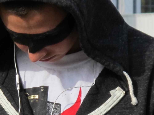 To "depersonalize" him, we put a black bar of makeup on his face and hands and made him wear a hoodie.