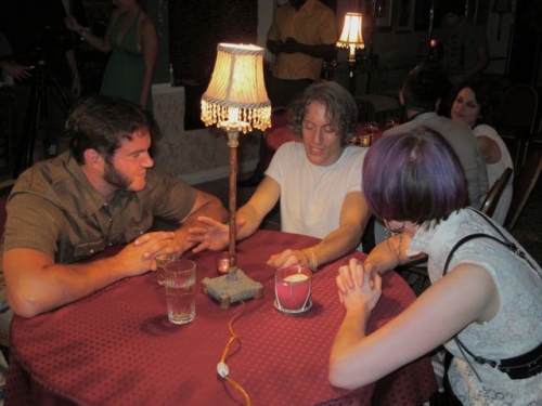 Jerry directs our cast of romantic leads...and all kinds of passion seemed to ooze right out of the aqua and midnight blue walls.